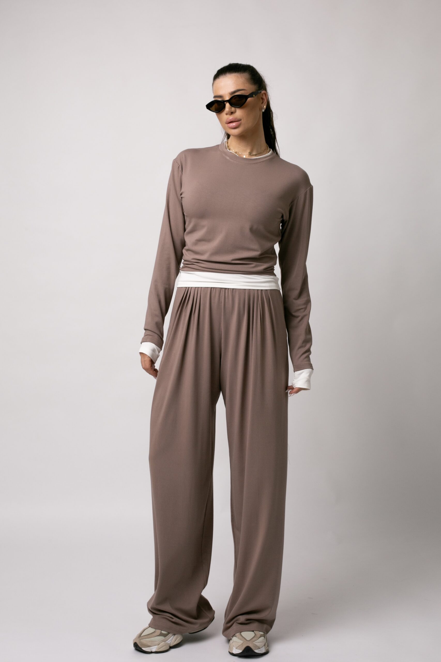Costum SKIMS realizat din bumbac cu elastan fin, plăcut la atingere, ce oferă confort și libertate de mișcare. Designul cu cădere fluidă conturează natural silueta, iar modelul este evidențiat de detalii contrastante – margini albe la gât și la manșete – pentru un look modern și rafinat.